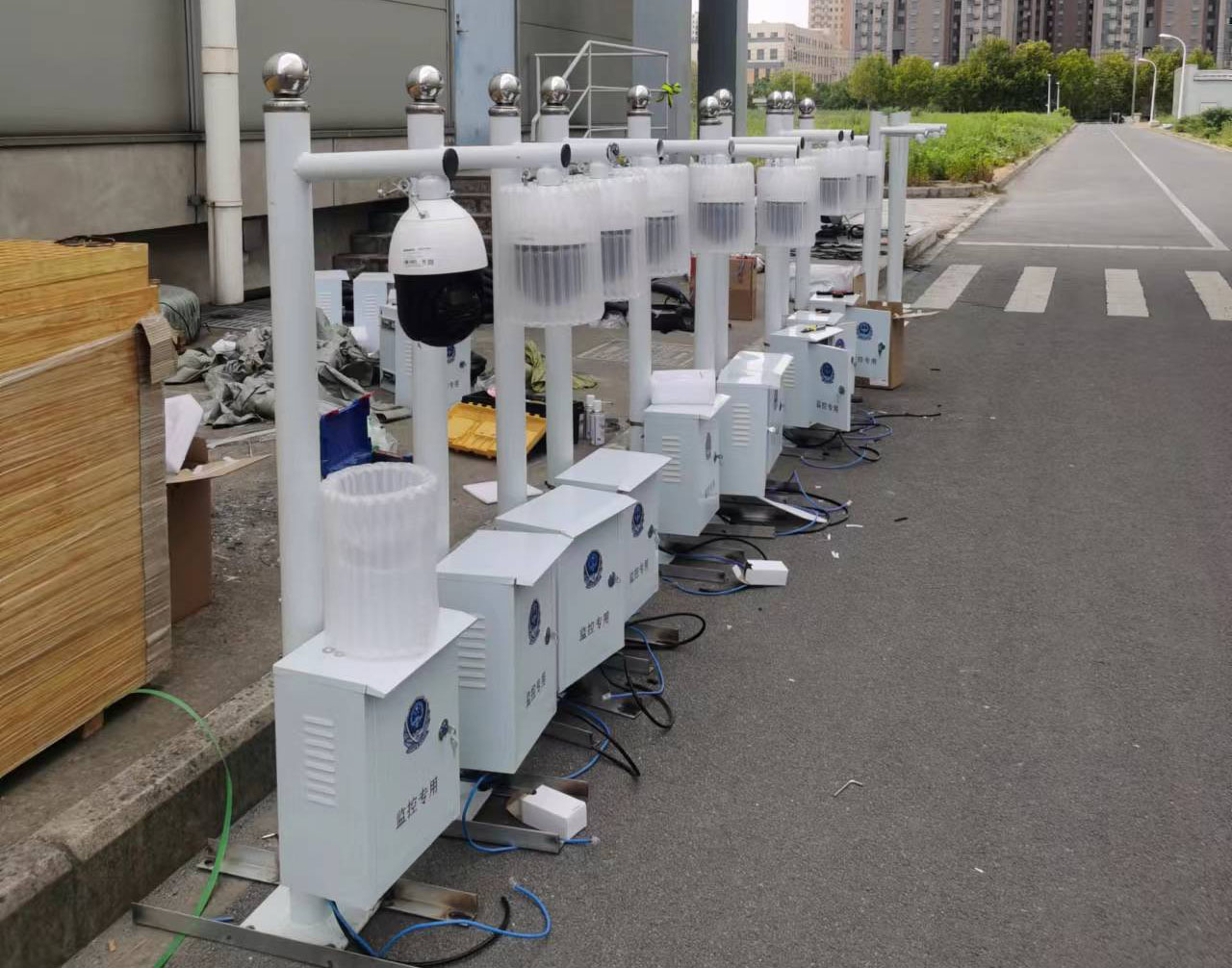 廠區(qū)道路圍墻屋頂監(jiān)控立竿安裝,全部360度攝像頭,光學(xué)22倍變焦,警戒、報警一體式。