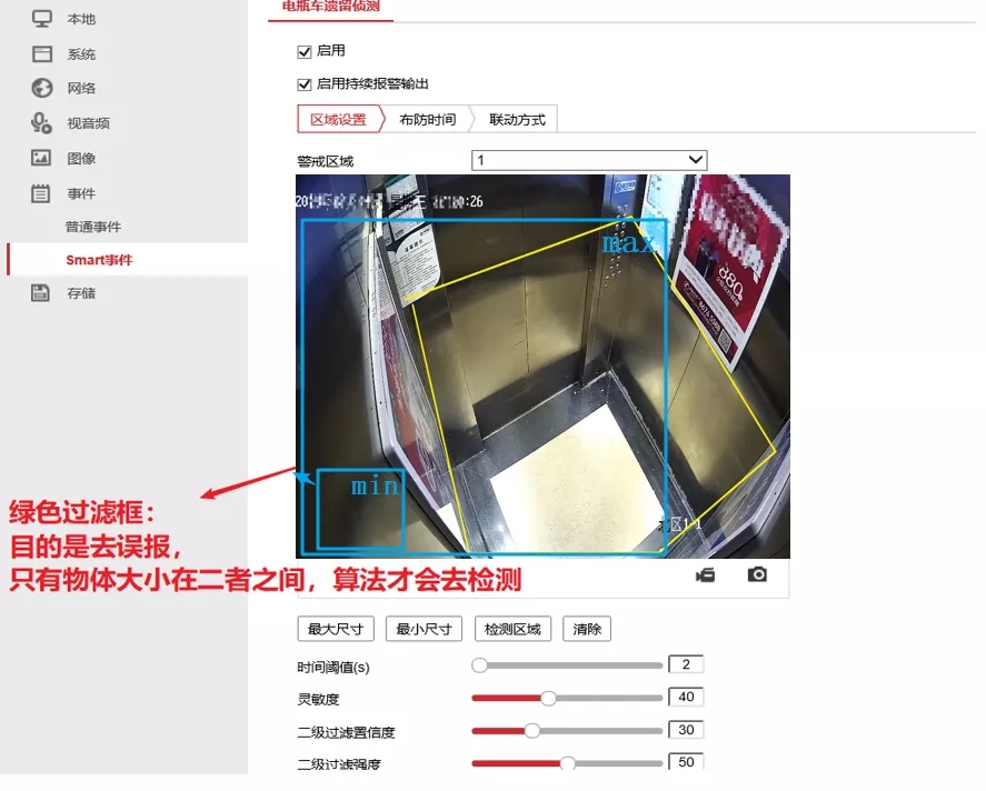 最小過濾框設(shè)置為畫面大小的5-15%左右,具體可以參考正常電瓶車檢出時(shí),綠色框大小靈活設(shè)置過濾。