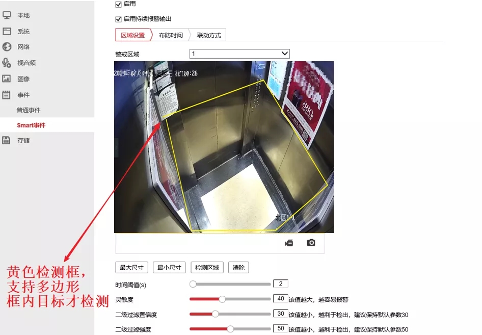 點(diǎn)擊【檢測區(qū)域】,繪制黃色的檢測框覆蓋電梯內(nèi)電瓶車檢測的區(qū)間范圍。為了不檢測到電梯墻壁上的物品影子、廣告牌、顯示屏滾動(dòng)播放的內(nèi)容,可繪制多邊形規(guī)則區(qū)域,避開電梯內(nèi)的廣告牌和側(cè)面壁的投影。