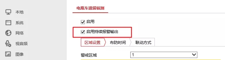 若現(xiàn)場需將IPC檢測到電瓶車的開關(guān)量信號(hào)聯(lián)動(dòng)輸出到其他裝置,推薦開啟持續(xù)報(bào)警輸出,延時(shí)時(shí)間配置為5S。